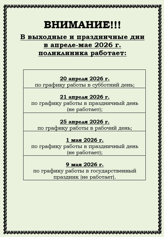 График работы поликлиники в выходные и праздничные дни Апрель-Май